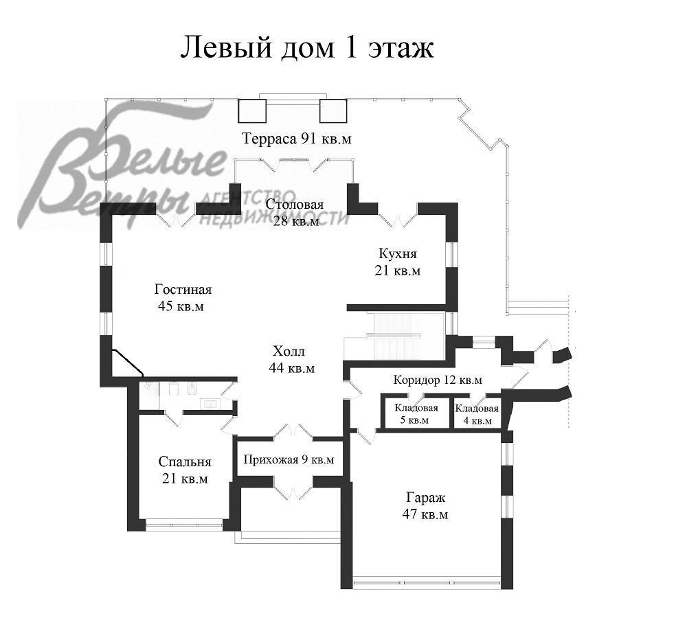 1-ый этаж: ЛЕВЫЙ ДОМ: прихожая 9 кв.м, спальня 21 кв.м, санузел 9 кв.м, холл 44 кв.м, гостиная 45 кв.м, столовая 28 кв.м, кухня 21 кв.м, коридор 12 кв.м, кладовая 5 кв.м, кладовая 4 кв.м, терраса 91 кв.м, гараж 47 кв.м.