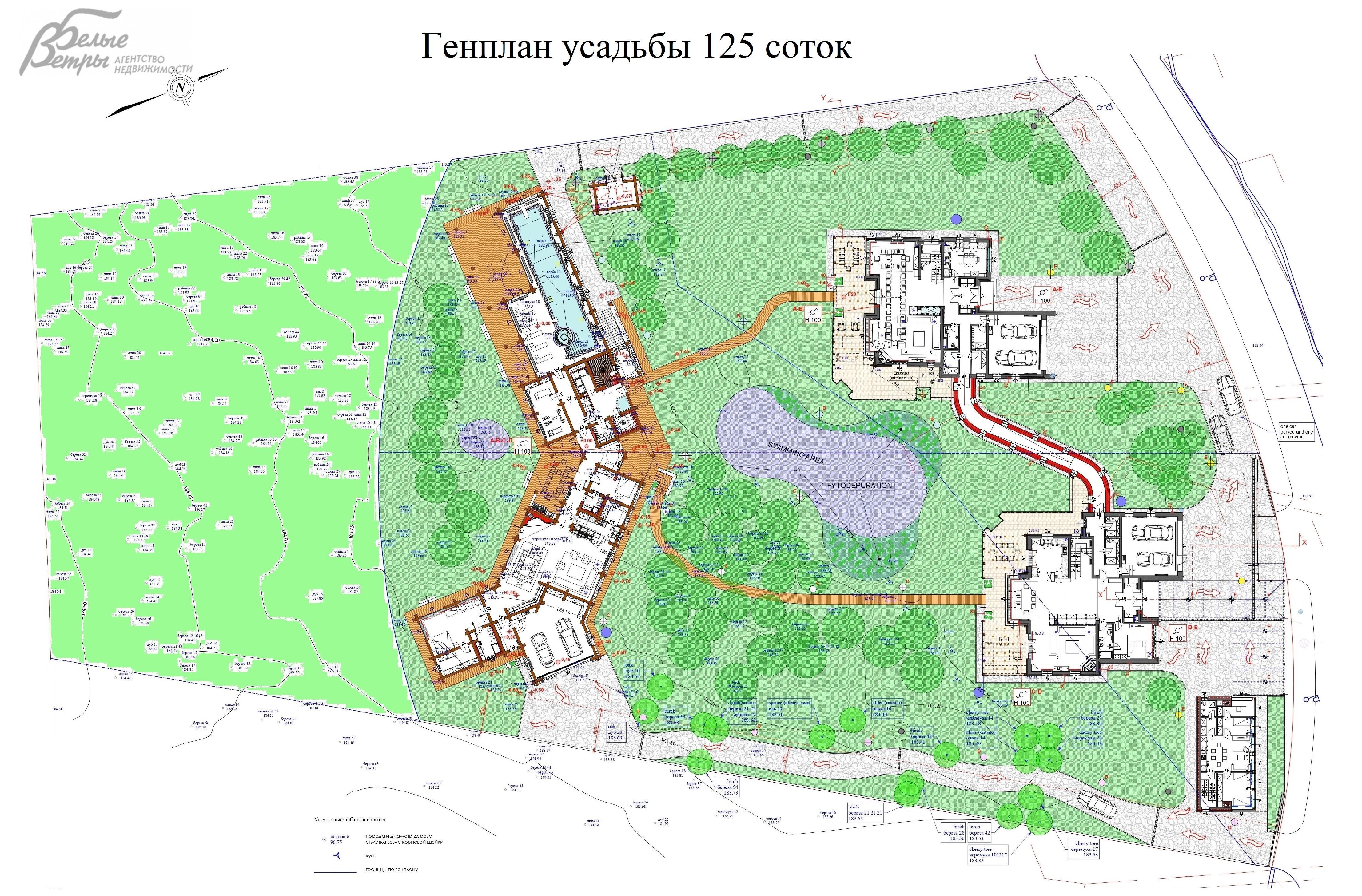 Дополнительные строения: - СПА-комплекс 620 кв.м: с переливным бассейном 18*3.5 м, переменной глубиной 1.2-3м (с римским входом, противотоком, трамплином, водопадом и гейзером), джакузи и зоной шезлонгов; две мастер-спальни; зона бань (русская парная с двумя печами, хамам отделанный малахитом и изразцами), тренажерный зал;