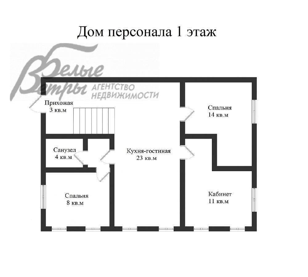 ДОМ ПЕРСОНАЛА: прихожая 3 кв.м, кухня-гостиная 23 кв.м, санузел 4 кв.м, спальня 8 кв.м, холл 2 кв.м, спальня 14 кв.м, кабинет 11 кв.м.