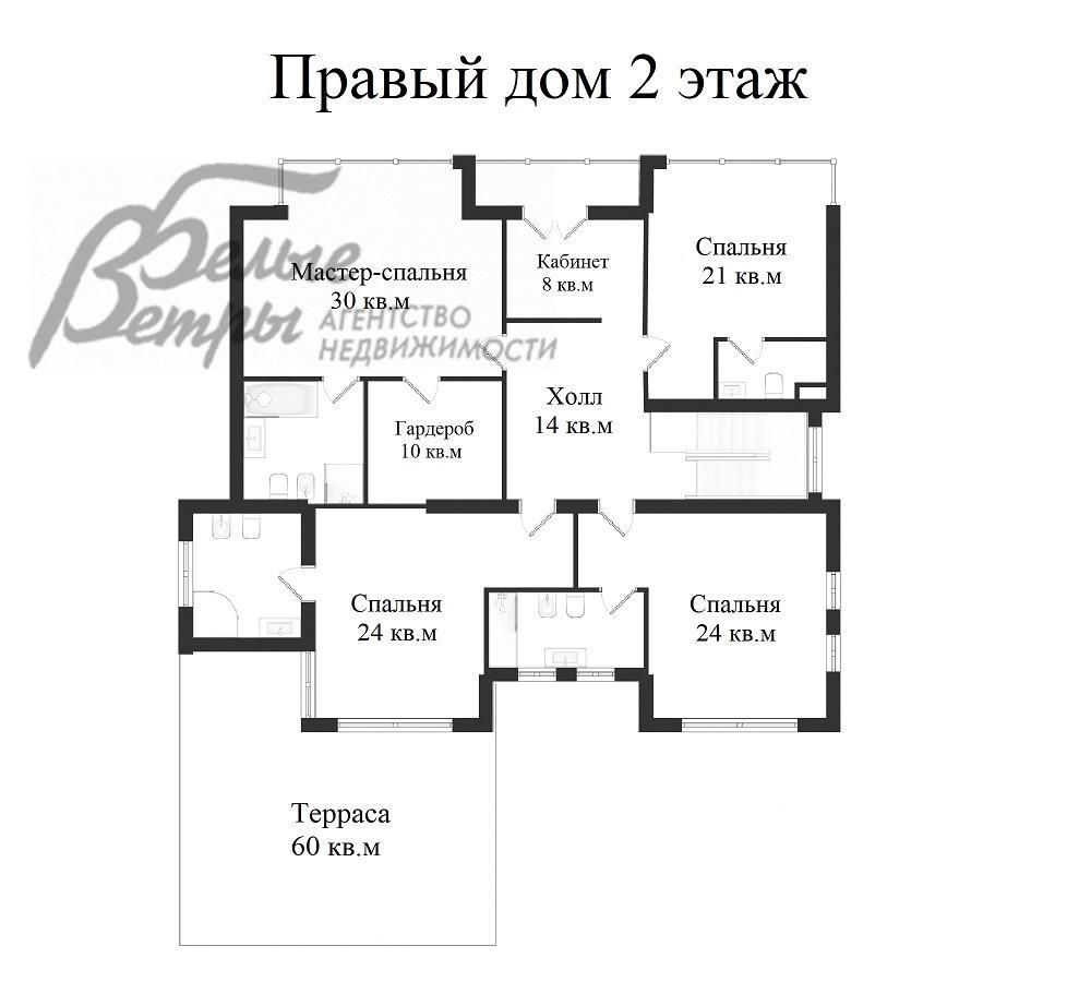 ПРАВЫЙ ДОМ: холл 14 кв.м, спальня 24 кв.м, санузел 8 кв.м, терраса 60 кв.м, мастер-спальня 30 кв.м, санузел 10 кв.м, гардероб 10 кв.м, кабинет 8 кв.м, балкон 5 кв.м, спальня 21 кв.м, санузел 4 кв.м, спальня 24 кв.м, санузел 8 кв.м.