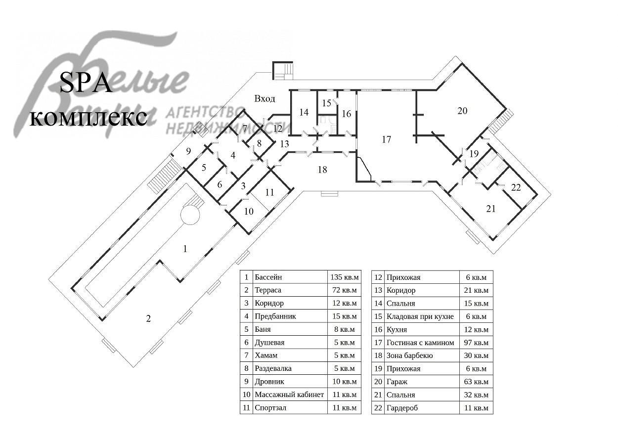 СПА-КОМПЛЕКС: помещение 135 кв.м с переливным бассейном длиной 18м (с римским входом, противотоком, трамплином, водопадом и гейзером), джакузи и зоной шезлонгов, терраса 72 кв.м, коридор 12 кв.м, баня 8 кв.м, дровник 10 кв.м, душевая 5 кв.м, прдбанник 15 кв.м, хамам 5 кв.м, раздевалка 5 кв.м, массажный кабинет 11 кв.м, спортзал 11 кв.м, прихожая 6 кв.м, крыльцо 16 кв.м, коридор 21 кв.м, зона барбекю 30 кв.м, спальня 15 кв.м, санузел 4 кв.м, кладовая при кухне 6 кв.м, кухня 12 кв.м, гостиная 97 кв.м, прихожая 6 кв.м, мастер-спальня 32 кв.м, гардеробная 11 кв.м, санузел 10 кв.м, гараж 63 кв.м.
