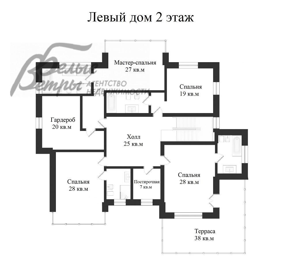 2-ой этаж: ЛЕВЫЙ ДОМ: холл 25 кв.м, постирочная 7 кв.м, спальня 28 кв.м, санузел 6 кв.м, коридор 6 кв.м, мастер-спальня 27 кв.м, санузел 11 кв.м, гардероб 20 кв.м, коридор 3 кв.м, спальня 19 кв.м, санузел 7 кв.м, спальня 28 кв.м, санузел 12 кв.м, терраса 38 кв.м.