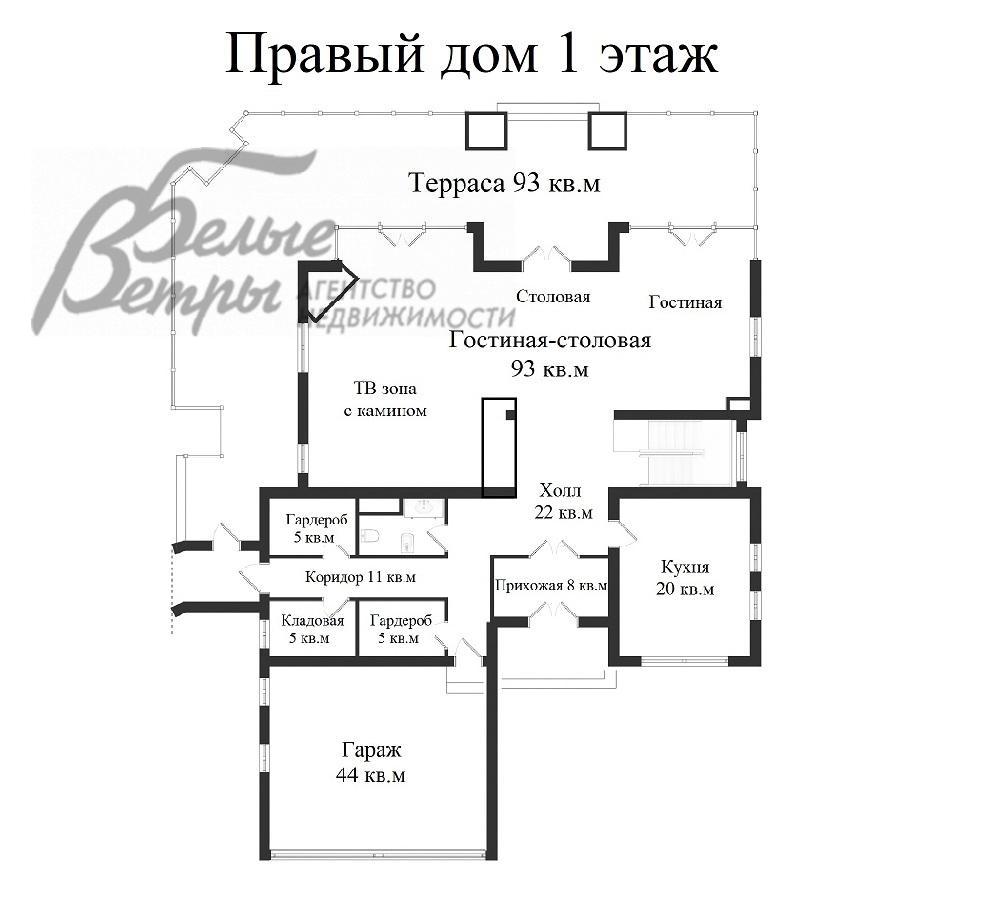 ПРАВЫЙ ДОМ: прихожая 8 кв.м, холл 22 кв.м, кладовая гардеробная 5 кв.м, гардеробная 5 кв.м, коридор 11 кв.м, кладовая 5 кв.м, санузел 4 кв.м, гостиная 53 кв.м, столовая 41 кв.м, терраса 93 кв.м, кухня 20 кв.м, гараж 44 кв.м.
